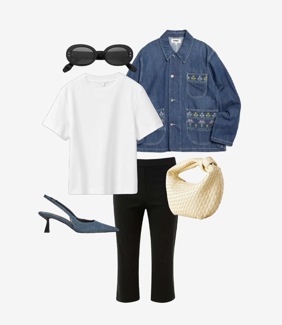 For a more casual look, switch the blazer for a denim jacket—opt for a style with detailing, embroidery, or a fun shape to complement the femininity of the capri silhouette. A slouchier tee has been added for an effortless vibe, balanced with dressy accessories. Rounded sunglasses reference back to the sixties shape of the capris, while pointed kitten heels prevent the trousers from cutting off your leg at the calf.