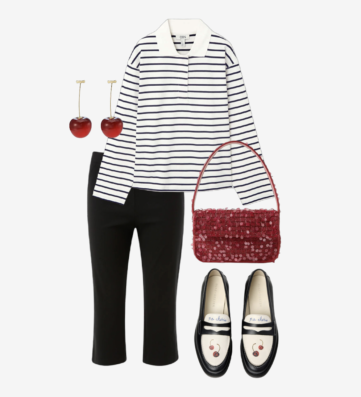 This one is potentially a bit more marmite, but try contrasting the trousers with a sportier silhouette! While a rugby shirt might not be the first thing you’d go to grab, sporty/dressy contrast outfits are long tried and tested and remain a firm favourite amongst the street style crowds. The details such as the stripe and the traditional style of loafer help to make the look feel more classic, while red accessories add a fun pop!