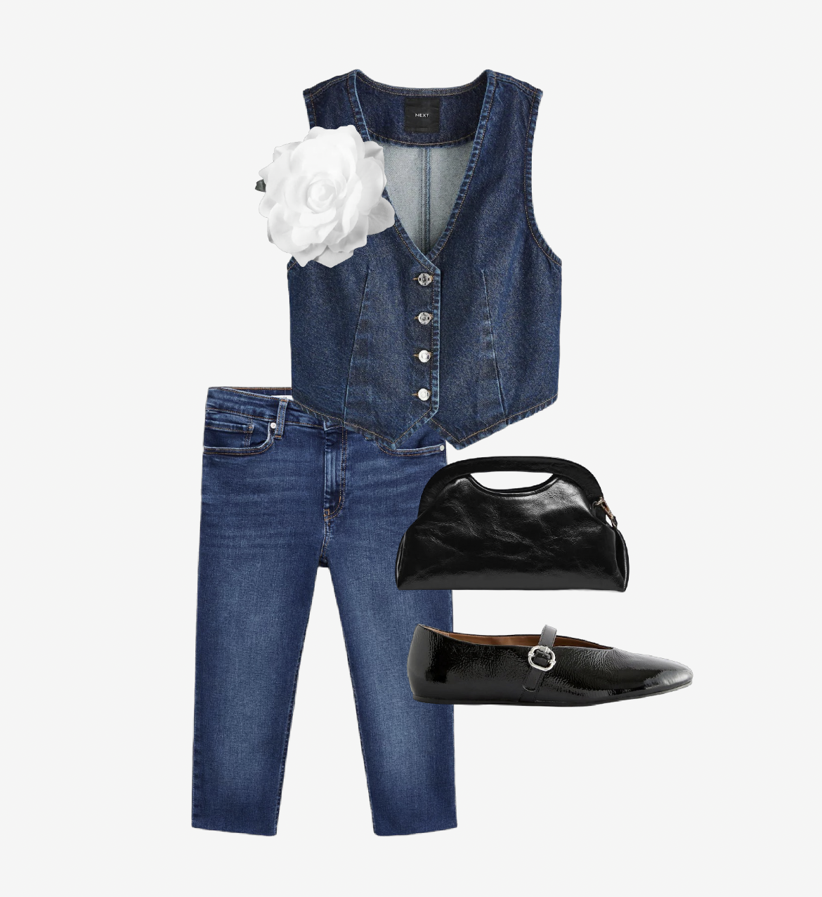 We all know one of the easiest outfits to wear is a co-ord, throw in some double denim and you’re on to a winner. The denim shades don’t have to match either; you could try a contrast light/dark wash combination. The accessories have been kept to black patent leather to add another texture to the outfit without taking away from the double denim, and the flower adds a feminine (and v Carrie Bradshaw) twist.