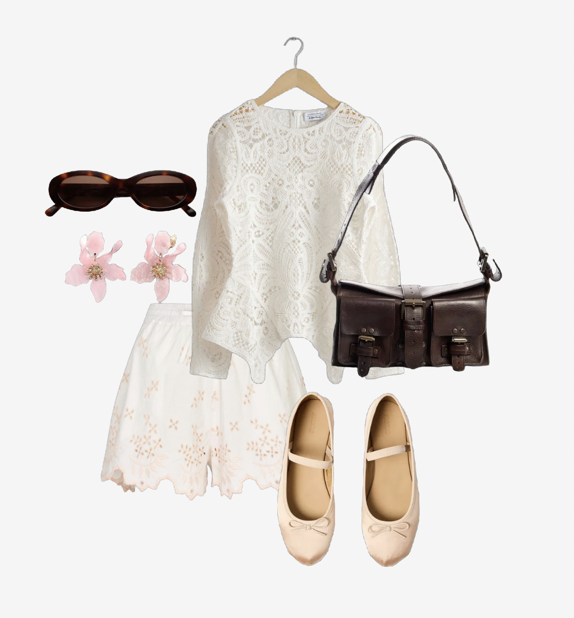 Light and airy, Broderie Anglaise is a summer staple for a reason. Whilst I’ve paired them here with a lace peplum top, they’d also look great worn as a co-ord or with denim (think interest denim like a waistcoat or boxy crop top). The colour palette has been centred around the subtle pink hue from the shorts, and brown has been used as a warm, yet grounding, contrast colour. The accessories are a mix of masculine and feminine, and nicely balance each other out.