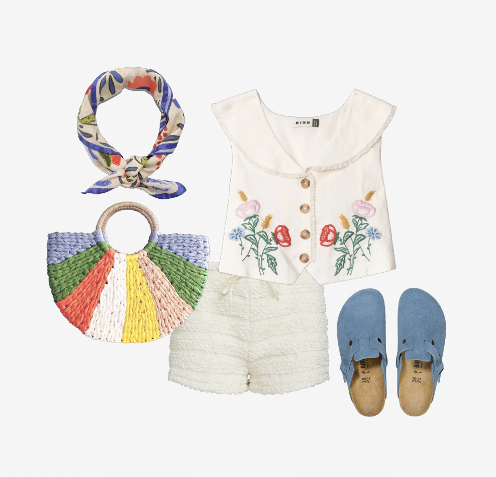 Granted, out of the list of alternatives, these are already a fast growing trend. Instead of styling them with a Ganni blouse and biker boots, try adding some interest with colour and leaning fully into the femininity of the silhouette. Pair with an equally delicate floral crop blouse and blue Birkenstocks to pull out the hues. A hand held colourful wicker bag adds a splash of colour to the midsection of the outfit, while a silk scare adds a European Summer feel. The versatility of the scarfs also means it could be worn in your hair, around your neck, or tied onto the bag. What a win!