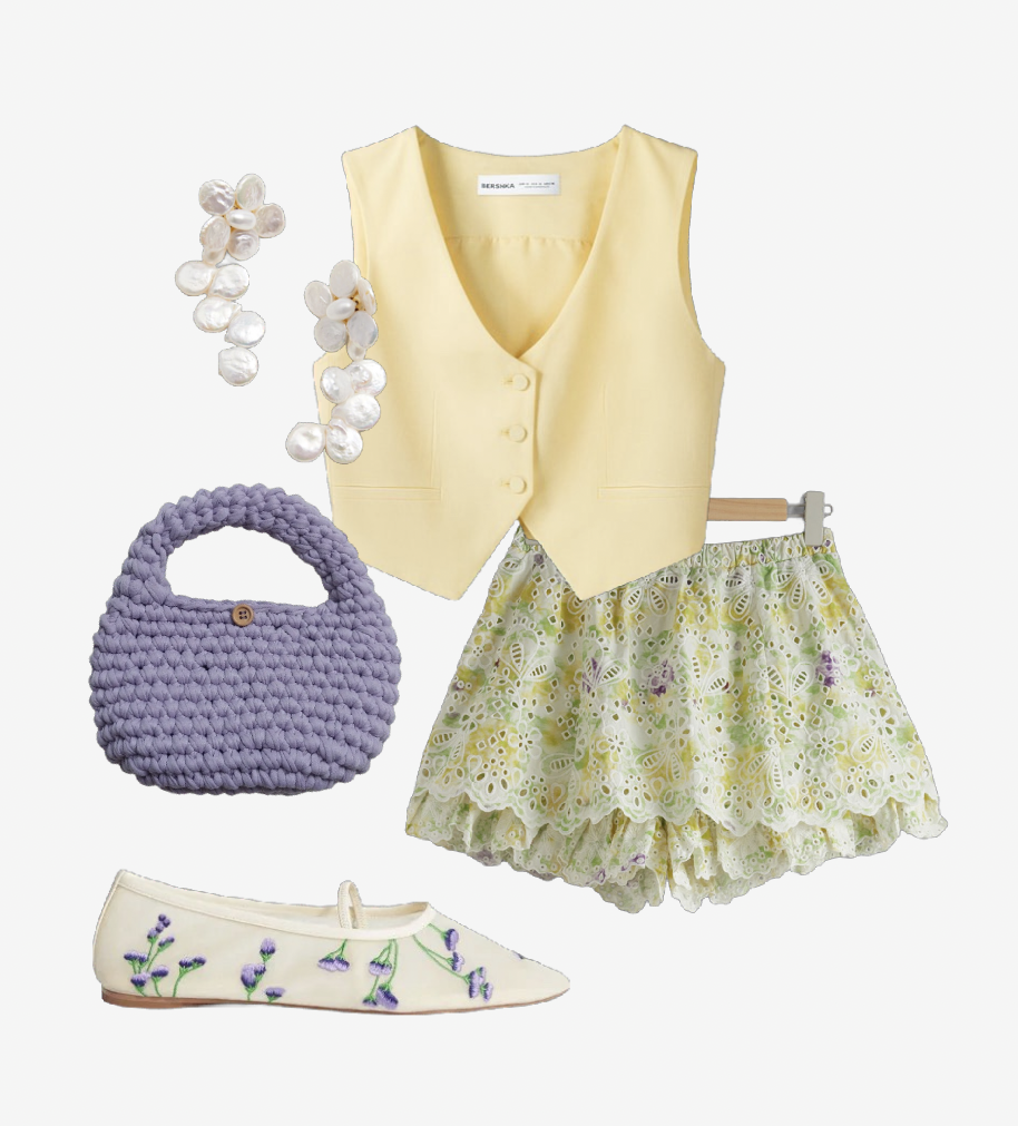 Florals for spring (summer!)? Always! Though often seen as a cliché, styling can elevate this print in a fun and even “groundbreaking” way. Try a floral print clash but in similar tones so it feels stylish but still harmonious and intentional. The shorts remain the centrepiece of this outfit by pairing them with items that pull colours from the print. The colour palette was kept light, with accessories chosen in seasonal fabrics for a summery feel.