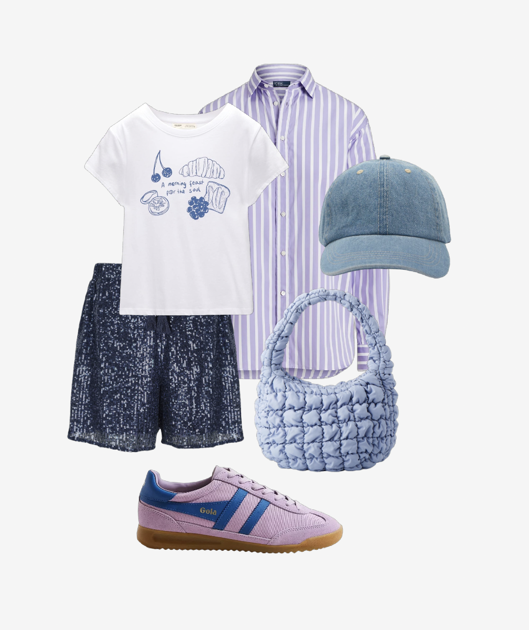 Sequins have been slowly crossing the seasonal boundary into Spring/Summer over the years, and a pair of shorts is the perfect way to wear them. Essentiality, style them down the same way you’d style a pair of cut offs. The colour palette has been kept to a clean but fresh lilac/blue tones, complimented with a touch of washed denim, and the outfit has an overall sporty, but eccentric, feel.