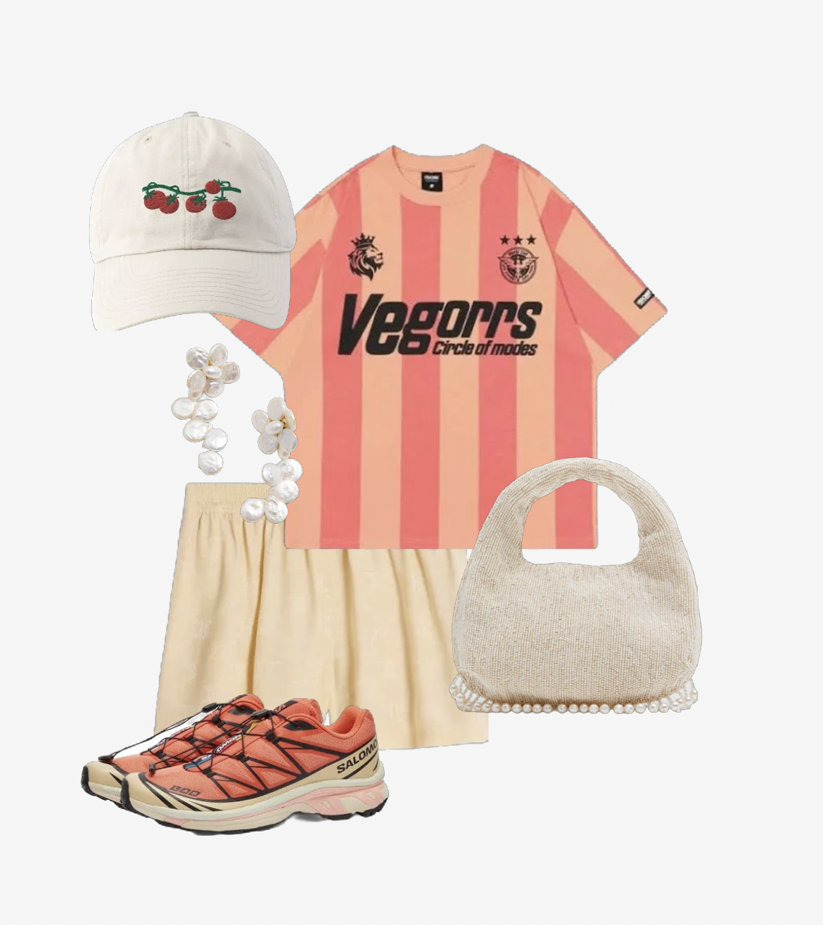 Think of these as the sophisticated older sister to the striped boxer short. While they could be dressed up, I’ve instead opted for a juxtaposition with sportier vibe. Football jerseys have been a fashion favourite for many lately, and the tones of this one perfectly complement the shorts. The Salomon trainers tie all the colours together, and the pearl bag and earring combo harks back to the more feminine shorts. A cap was added as a finishing touch, because if in doubt, add a cap (aka the cool girl manifesto).